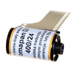 Fomapan 400/24 to amatorski negatywowy film czarno-biały - małoobrazkowy 35 mm. Wysoka czułość: 400 ASA - 27 DIN i minimum około 23-24 klatki formatu 24x36mm - film jest ręcznie nawijany z puszki do kasetek jednorazowego użytku ale BEZ KODU DX 400.