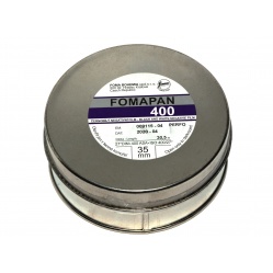Małoobrazkowa klisza w popularnym formacie 35 mm. najczęściej do zdjęć w formacie 24x36 mm. - amatorski negatyw o uczuleniu panchromatycznymi o dość wysokiej czułość 400 ASA - 27 DIN. Z materiałów czarno białych czulsza jest tylko Delta 3200/36 Ilforda. Opakowanie w puszce zawiera 30,5 metra filmu, co starcza na przygotowanie ok. 17 - 18 filmów 36 klatkowych - każdy o długości 1,7 metra. Do przygotowania filmu potrzebne są kasety plastikowe lub metalowe wielokrotnego użytku. Można także przyklejać ucięty i odmierzony film do końcówek filmu wystającego z kaset jednorazowych. Do odmierzania, obcinania filmu i ładowania go w kasetę przydaje się także zgrabne urządzenie do w/w celów. Zarówno kasety jak i ładowarkę do filmów polecamy w naszej ofercie. Film Fomapan 400 przeznaczony jest fotografowania w wielu standardowych sytuacjach. Można go stosować w dobrym, średnim i gorszym oświetleniu. Daje się forsować w górę i w dół o 1 przesłonę czasem więcej... Foma 400 jest kliszą dającą wyraźnie NAJMNIEJSZY kontrast z filmów Fomapan i chyba największe ziarno oprócz Delty 3200. Naświetlanie filmu na 200 ASA zmniejszy jeszcze bardziej kontrast i ziarno. Forsowanie na 800 ASA powiększy znacznie kontrast i ziarno. Obróbka w wywoływaczach do tradycyjnej emulsji: Atomal, Rodinal - R09, Kodak D76, Ilfosol S, Utrafin itd. Fomapana 400 można obrabiać w wywoływaczach przeznaczonych do Delty i T-maxa - wtedy uzyskamy mniejsze ziarno i lepszą tonalność. To chyba film z największym ziarnem z dostępnych na rynku filmów. Fomapan 400 jest filmem o tradycyjnej srebrowej emulsji.
