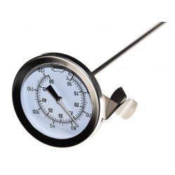 Termometr do pomiaru temperatury procesów fotograficznych. NIE jest wykonany z plastiku czy szkła tylko stali. Nóżkę termometru należy zanurzyć w płynie - najlepiej na długości 15 cm. Zacisk nakładamy na brzeg koreksu czy kuwety. Zaletą wskazówki jest to, że w ciemności... świeci na zielono.