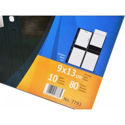 Koszulki polipropylenowe w czarnym kolorze, każda przeznaczona na 8 odbitek formatu 9x13 cm. po 4 odbitki na każdą stronę stronę w układzie poziomym. Odbitki wsuwane od góry zabezpieczone są wysoko przezroczystą folią ochronną. Koszulka ma otwory do wpięcia w segregator. Kartonowe opakowanie zawiera 10 koszulek na 80 odbitek. Koszulkę można wpiąć także w zwykły segregator biurowy - niekoniecznie fotograficzny. Oferujemy koszulki na inne formaty odbitek.