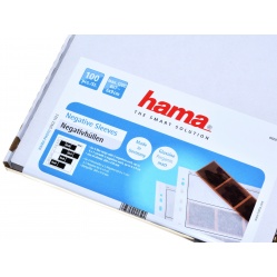 Pergaminowe koszulki do segregatorów fotograficznych - dużo mniej przezroczyste niż acetatowe - na szeroki obrazek, typ 120. Lepiej sprawdzają się w archiwizacji, "oddychają" i nie elektryzują się jak wykonane z acetatu. Mają po cztery poziome kieszonki, każda mieści wsuwany z boku odcinek z 3 klatkami 6x6 cm. 4 klatkami 6x4,5 cm. 3 klatkami 6x7 lub 2 klatkami 6x9 cm. W koszulkach można z grubsza oceniać negatyw oglądając je pod światło lub - lepiej i wygodniej - korzystając z podświetlarki. Opakowanie Hamy zawiera 100 sztuk folii na film. Koszulki nadają się tylko do przechowywania w segregatorach fotograficznych. Ze standardowych segregatorów - biurowych - wystają, są do nich za szerokie. W segregatorach biurowych można przechowywać koszulki węższe, specjalnie robione pod tym kątem.