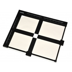 Maskownica o blaszanej podstawie i ramie oraz dwóch przesuwanych lamelek - do papieru formatu 24x30 cm. - praktycznie 28x34 cm. z ramkami. Mieści jednak papier formatu 30x40 cm. jednak naświetlić można go tylko z marginesami z każdej strony. Lamelki przesuwamy zawsze przy podniesionej maskownicy. Biała wyraźna skala w centymetrach i calach. Zaletą jest możliwość ustawienia kąta prostego lamelek gdyby się zwichrowały. Służą do tego dwie śrubki na spodzie każdej lamelki przy ramie. Wada to przymusowe ustawianie marginesu jednocześnie w pionie i poziomie. Służy do tego jeden element, ale wygodny, bo dostępny przy opuszczonej maskownicy. Wielkość marginesów od 5 do 12 mm. Maskownica posiada łapki, które przytrzymują papier przy opuszczonej maskownicy.