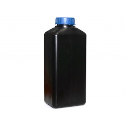 Czarna butelka - z nakrętką w kolorze niebieskim - o pojemności 1 l. do przechowywania chemii. Jest wykonana z tworzywa nie przepuszczającego światło ! Ma niestety bardzo wąski otwór wlewowy - dużo mniej wygodny od dostępnych u nas butelek innych producentów.Na butelce nie ma żadnej podziałki, skali czy napisu. Polecam do przechowywania wywoływaczy negatywowych i pozytywowych, które wymagają przechowywania w butelkach ciemnych w chłodnym miejscu bez dostępu powietrza. Światło, tlen z powietrza (reaguje z wywoływaczem) oraz wysoka temperatura przechowywania przyspieszają proces starzenia. W przezroczystych butelkach można przechowywać utrwalacze, odbielacze, przerywacze, kąpiele zwilżające i inne, Utrwalacze i przerywacze na światło nie reagują i nie psują się od niego. Nie znaczy to oczywiście, że można je naświetlać mocnym światłem słonecznym lub sztucznym. Przerywacze proponowałbym używać jako kąpiele jednorazowe.